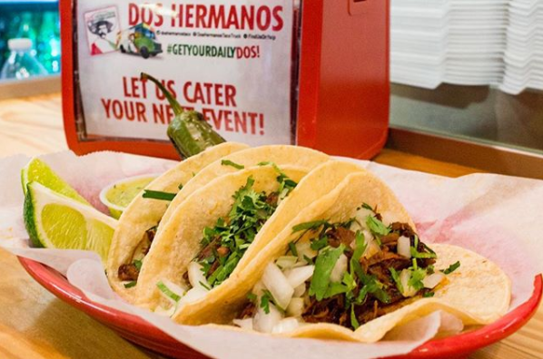 Look for delicious options like: Authentic Mexican Street Tacos, The Dos Hermanos Tacos, Birria Tacos, Burritos, Chicken Enchiladas, the Market Burrito, Fresh Guacamole, Pico, Salsa, and if you’re lucky enough to catch them, they are famous for their Steamed Tamales which come from recipe native to Oaxaca, Mexico.